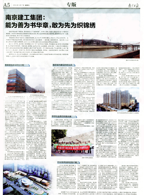 《南京日?qǐng)?bào)》對(duì)南京建工集團(tuán)進(jìn)行專版報(bào)道2014年3月7日,《南京日?qǐng)?bào)》A5專版以《南京建工集團(tuán):能為善為書(shū)華章,敢為先為織錦繡》為題,對(duì)集團(tuán)進(jìn)行全面報(bào)道。
